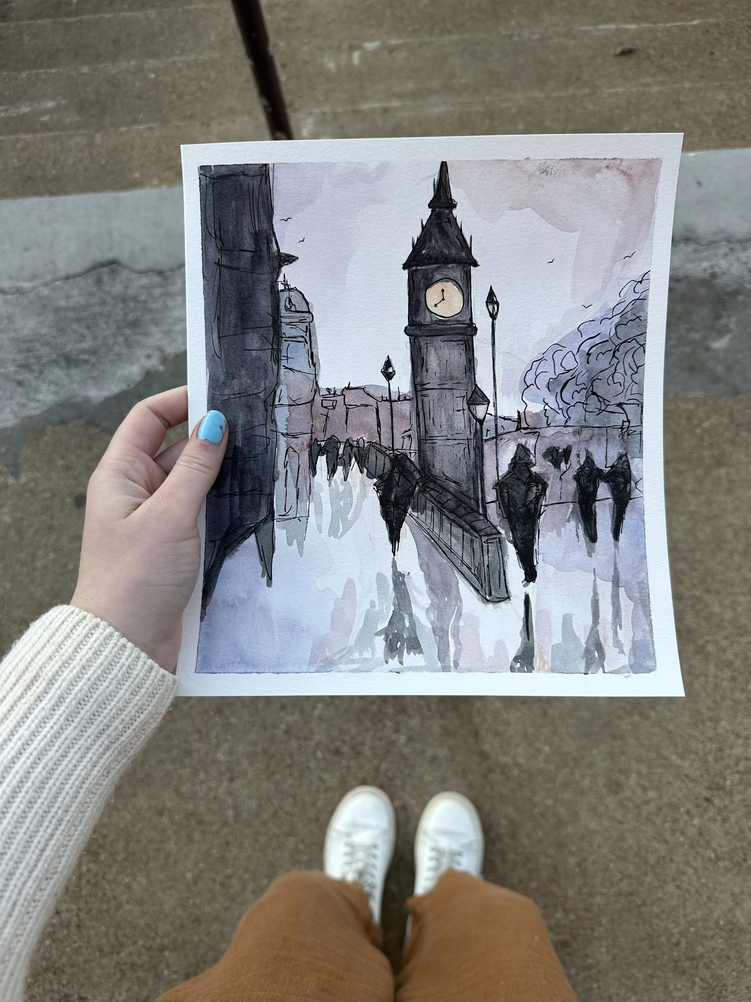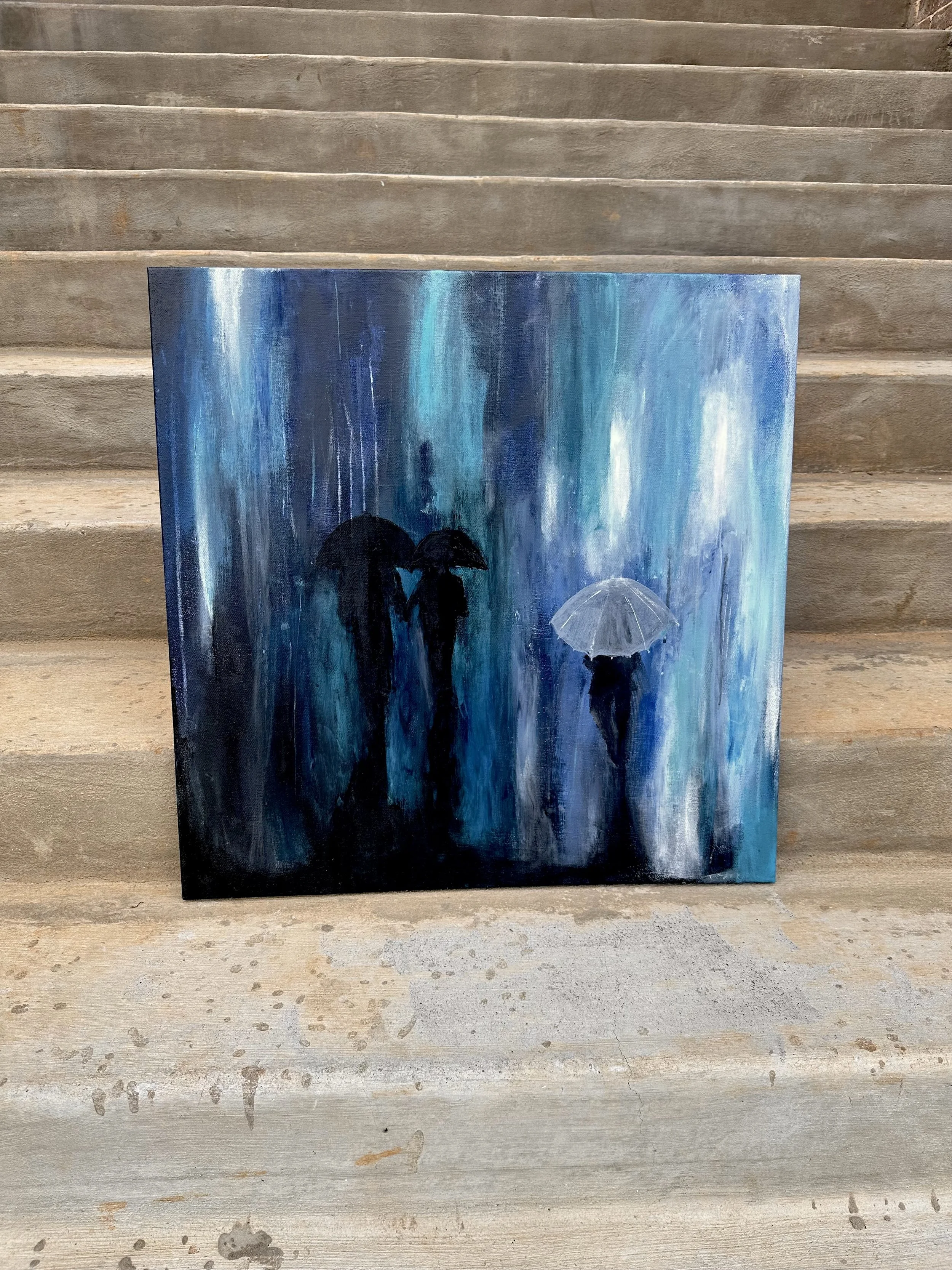 Created on a 24×24 canvas, this was made as an abstract painting showcase a rainy day walk at night. It’s still one of my favorite pieces due to the vibrant colors.